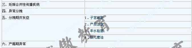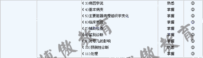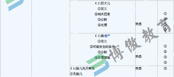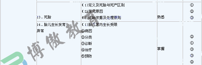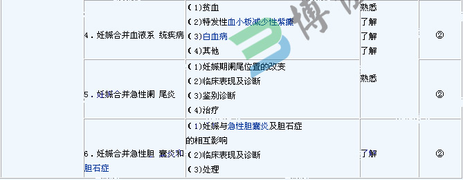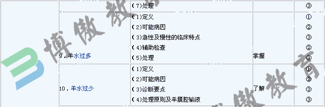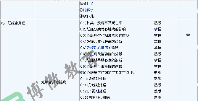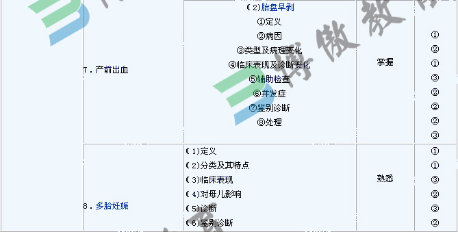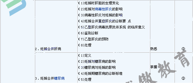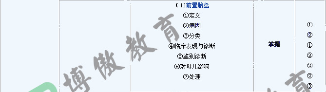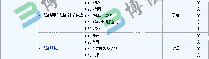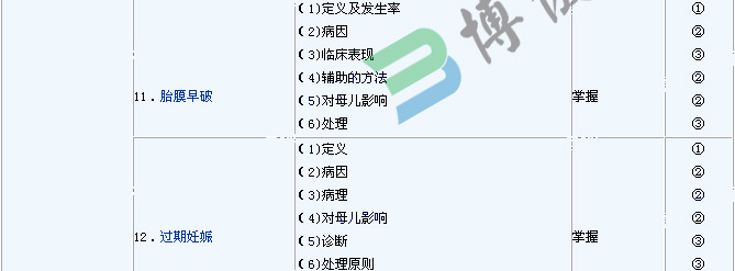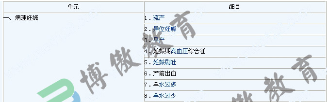 博傲网校小编整理了2017年妇产科主治医师考试大纲,希望对大家有所帮助,祝大家顺利通过考试。 2017年妇产科主治医师卫生资格考试大纲-①—基础知识;②—相关专业知识;③—专业知识 单 元 细 目 要 点 要求 科目 一、女性生殖系 1.骨盆 (1)骨盆的类型 掌握 ① 2.外生殖器 外阴的范围和组成 掌握 ① 3.内生殖器 内生殖器及其功能 掌握 ① 4.女性生殖系统血 管和淋巴 (1)盆腔血管来源与分支 熟悉 ① 5.骨盆底 (1)骨盆底 掌握 ① 6.邻近器官 掌握 ① 二、女性生殖系 1.女性一生各时期 的生理特点 (1)新生儿期 掌握 ① 2.月经及月经期的 临床表现 (1)月经的定义 掌握 ① 3.卵巢的功能及其 周期性变化 (1)卵巢功能 掌握 ① 4.月经周期的调节 掌握 ① 5.子宫内膜及生殖 器其他部位的周期 性变化 (1)子宫内膜的周期性变化 掌握 ① 6.下丘脑-垂体- 掌握 ① 7.肾上腺皮质、甲 (1)肾上腺皮质 (3)前列腺素 了解 ① 三、妊娠生理 1.受精与受精卵发 熟悉 ① 2.胚胎、胎儿发育 特征及胎儿生理特 点 3.胎儿附属物的形 成及其功能 1. 胚胎、胎儿发育特征 熟悉 ① 2. 胎儿生理特点 (1)胎盘 掌握 ① 4.妊娠期母体变化 (1)生殖系统及乳房的变化 掌握 ① 四、妊娠诊断 1.早期妊娠诊断 (1)病史与症状 掌握 ③ 2.中晚期妊娠诊断 (1)病史与症状 掌握 ③ 3.胎产式、胎先露、 胎方位 (1)胎势 掌握 ③ 五、产前保健 1.孕妇监护 产前检查的时间、内容 掌握 ③ 2.孕妇管理 了解 ② 3.胎儿宫内监护 (1)高危儿识别 掌握 ③ 4.孕期营养 了解 ③ 5. 产科合理用药 孕期用药的原则、种类 熟悉 ③ 6. 孕期常见症状 了解 ③ 7.遗传咨询、遗传 筛查与产前诊断 (1)遗传咨询 了解 ② 六、正常分娩 1.分娩动因 (1)机械性理论 了解 ① 2.决定分娩的四因 素 (1)产力 掌握 ② 3.枕先露的分娩机 掌握 ① 4.分娩的临床经过 及处理 (1)先兆临产 掌握 ③ 5. 分娩镇痛 了解 ③ 七、正常产褥 1.产褥期母体变化 (1)生殖系统的变化 掌握 ① 2.产褥期临床表现 掌握 ③ 3.产褥期处理及保 健 (1)产褥期处理 掌握 ③ 八、病理妊娠 1.流产 (1)概念 掌握 ① 2.异位妊娠 熟悉 ② ③ 3.早产 (1)原因 掌握 ② 4.妊娠期高血压疾 病 (1)概念 掌握 ① 7. 妊娠合并肠梗 阻 (1)妊娠与肠梗阻的关系 了解 ② 十、妊娠合并性 1.妊娠合并梅毒 (1)对胎儿的影响 熟悉 ② 2.妊娠合并淋病 (1)对妊娠、分娩、胎儿的影响 熟悉 ② 3.妊娠合并尖锐湿疣 (1)对妊娠及胎儿的影响 熟悉 ② 4.妊娠合并巨细胞 病毒感染 (1)传播途径 了解 ② 5.妊娠合并生殖器 疱疹 (1)分型 了解 ② 6.妊娠合并沙眼衣 原体感染 (1)对妊娠、胎儿及新生儿的影 了解 ② 7.妊娠合并艾滋病 了解 ② 8.支原体感染 了解 ② 十一、异常分娩 1.产力异常 (1)子宫收缩乏力的病因 掌握 ② ① 2.产道异常 (1)骨产道异常 掌握 ① 3.胎位异常 (1)持续性枕后位、 枕横位 (2)高直位 (3)前不均倾位 (4)面先露 (5)臀先露 (6)肩先露 (7)复合先露 ① 病因 掌握 ② ② 分类 掌握 ① 4.异常分娩的诊治 (1)诊断 掌握 ③ 十二、分娩期并 1.子宫破裂 (1)定义 掌握 ① 2.产后出血 (1)定义、病因、分类 掌握 ① 3.羊水栓塞 (1)定义 熟悉 ① 4.胎儿窘迫 (1)定义 掌握 ① 5.脐带异常 (1)脐带过长 掌握 ③ 十三、产褥期异 1.产褥感染 (1)概念 掌握 ① (6)处理 ③ 2.晚期产后出血 (1)定义 掌握 ① 3.抑郁症 定义及表现、诊断、治疗与预防 熟悉 ② 4.中暑 定义及表现、诊断、治疗与预防 了解 ② 十四、妇科病史 1.妇科病史 采集病史的侧重点与方法 掌握 ① 2.妇科检查 准备与注意事项、方法步骤 掌握 ① 3.妇科常用特殊检 查 (1)阴道分泌物悬滴检查 掌握 ③ 十五、外阴色素 1.外阴鳞状上皮细 胞增生 (1)病理 了解 ② 2.外阴硬化性苔藓 (1)病因 了解 ② 3.其他外阴皮肤病 (1)外阴白癜风 了解 ② 十六、女性生殖 1.外阴炎症 ① 病因 了解 ② 2.阴道炎症 ① 病因 掌握 ② 3.宫颈炎症 ① 病因及病原体 掌握 ② 4.盆腔炎症 (1)盆腔炎性疾病 掌握 ② (2)盆腔炎性疾病后遗症 熟悉 ② 5.生殖器结核 (1)传染途径 熟悉 ② 十七、女性生殖器肿瘤 1.外阴良性肿瘤 熟悉 ② 2.VIN 与外阴癌 (1)外阴上皮内瘤样病变 熟悉 ② ②病理 ② (2)外阴癌 熟悉 3.CIN 与宫颈癌 (1)发病相关因素 掌握 ② 4.子宫内膜增生与 子宫内膜癌 (1)发病相关因素 掌握 ② 5.卵巢肿瘤 (1)组织学分类 掌握 ① 6.子宫肌瘤 (1)发病相关因素 掌握 ② 7.子宫肉瘤 (1)组织来源及病理 熟悉 ② (2)临床分期 ① 8.输卵管肿瘤 (1)病理 了解 ② 十八、滋养细胞 1.葡萄胎 (1)概念 掌握 ① 2.侵蚀性葡萄胎 (1)概念 掌握 ① 3.绒癌 (1)病理 掌握 ② 4.胎盘部位滋养细 胞肿瘤 (1)病理 了解 ② 十九、月经失调 1.无排卵性功血 (1)概念 掌握 ① 2.有排卵性功血 (1)分类 掌握 ① (5)鉴别诊断 ② 3.闭经 (1)病因 掌握 ② 4.多囊卵巢综合征 (1)病理 掌握 ② 5.围绝经期综合征 (1)概念 熟悉 ① 6.痛经 (1)概念 熟悉 ① 7.经前期紧张综合 征 (1)病因 熟悉 ② 8.高催乳激素血症 (1)发病机制 了解 ② ③ ③ ③ 二十、子宫内膜 1.子宫内膜异位症 (1)概念 掌握 ③ 2.子宫腺肌病 (1)概念 掌握 ① 二十一、女性生 二十二、女性盆 底功能障碍性 疾病及生殖器 官损伤 1.生殖器官发生 (1)生殖腺的发生 了解 ① 2.女性生殖器官发 育异常 (1)处女膜闭锁 熟悉 ① 3.两性畸形 (1)女性假两性畸形 了解 ① 1.子宫脱垂 (1)概念 掌握 ① (2)临床分度 ① (3)病因 ② (4)临床表