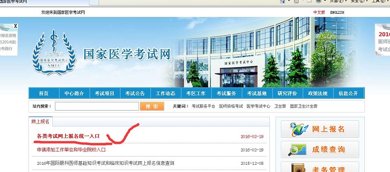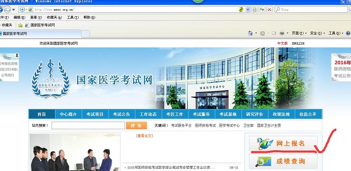 第一步:登陆国家医学考试网(网址:http://www.nmec.org.cn/),点击右上角的网上报名栏;