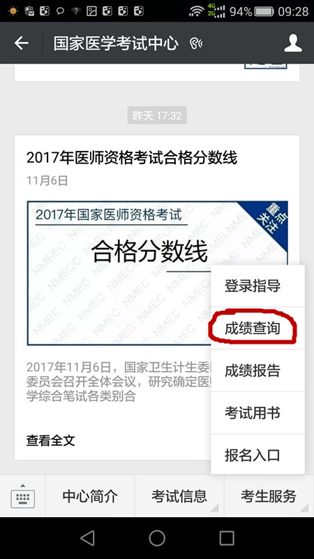 你知道2017年医师资格考试成绩查询的首选姿势是什么吗?那就是手机微信查询,下面博傲网校小编就来详细介绍一下,如何用微信查询2017年医师资格考试成绩。 第一步:打开国家医学考试网微信公众号“国家医学考试中心”(微信号:NMEC1985,没有关注的请先关注) 第二步:点击公众号右下角的“考生服务”,在弹出的菜单栏里选择“成绩查询” 第三部:在打开的页面上按提示输入笔试准考证号、身份证号以及验证码即可。 除了微信查询方式外,大家还可以拨打电话:010-59935001,59935002,59935003,59935004;或者是登录国家医学考试服务系统,即国家医学考试网(网址http://www.nmec.org.cn/Pages/ArticleList-17-0-0-1.html)入口进行查询。 以上是由小编为大家整理的2017年医师资格考试成绩查询新姿势。更多考试资讯及备考资料,请关注博傲网校! 19年来,我们只做医考培训,我们不是招生最多的,但是我们是通过率最高的!医师考试通过率低,怎么才能一考过关呢?通关技巧热线:400-1680561 你想知道一考过关的秘籍吗?扫描下面的“eduyishi”微信二维码或加QQ群号,即可提前获取最新必考知识点,说不定有考试原题哦: 临床执业/助理医师问题讨论群:249310992 扫一扫关注博傲医师微信公众号 博傲金题App免费下载,注册时输入邀请码1460[海量试题][历年真题]