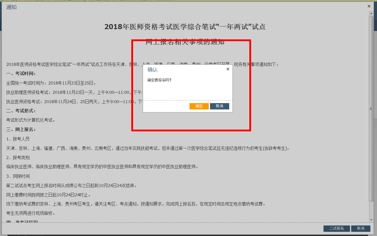 2018年医师资格考试医学综合笔试“一年两试”试点工作将在天津、吉林、上海、福建、广西、海南、贵州、云南考区开展。现将有关事项通知如下: 一、考试时间: 全国统一考试时间为:2018年11月23日至25日。 执业助理医师资格考试:2018年11月23日一天,上午9:00—11:00,下午14:00—16:00.每单元2小时。 执业医师资格考试:2018年11月24日、25日两天,上午9:00—11:00,下午14:00—16:00.每单元2小时。 二、考试形式: 考试形式为计算机化考试。 三、网上报名: 1.报考人员 天津、吉林、上海、福建、广西、海南、贵州、云南考区,通过当年实践技能考试,但未通过第一次医学综合笔试且无违纪违规行为的考生(含缺考考生)。 2.报考类别 临床执业医师、临床执业助理医师、具有规定学历的中医执业医师和具有规定学历的中医执业助理医师。 3.网报时间 第二试试点考生网上报名时间从成绩公布之日起到10月24日24点结束。 网上缴费时间自网报之日起10月24日24时止。 线下缴纳考试费的吉林、上海、贵州考区考生,请关注考区、考点通知,按通知要求,完成网上报名后,在规定时间去规定地点缴纳考试费。 考生无须再进行现场审核。 报名入口:国家医学考试中心 四、准考证打印: 考生缴纳第二试考试费后方能在11月15日至22日期间打印本人准考证。 以上是“2018年临床执业医师”一年两试“报名|缴费|准考证打印时间”的全部内容,由博傲网校小编为您整理,如果您觉得这篇文章还不错,可以分享给身边的朋友。 19年来,我们只做医考培训,我们不是招生最多的,但我们是合格率最高的!医考热线电话:400-6286615 你想知道医考合格的秘籍吗?扫描微信二维码直接加QQ群,即可提前获取最新必考知识点或 最新考试资讯: 临床执业/助理医师问题讨论群:249310992 扫一扫直接加QQ学习群 扫描立即做题 [海量试题][历年真题]等你练!
