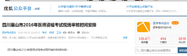 媒体来源搜狐网。 四川眉山市2016年医师资格考试现场审核时间安排: 根据《医师资格考试暂行办法》(原卫生部令第4号)规定和四川省医师资格考试领导小组公告(第17号)要求,为确保2016年医师资格考试考务工作科学、公平、安全和规范进行,医学考试在线现将我市2016年医师资格考试有关事项通知如下: 一、报名条件 依据《中华人民共和国执业医师法》及有关规定,具有下列条件之一的,可以参加医师资格考试: (一)具有高等学校医学专业本科以上学历,在执业医师指导下,在医疗、预防、保健机构中试用期满一年的可以参加执业医师资格考试; (二)取得执业助理医师执业证书后,具有高等学校医学专科学历,在医疗、预防、保健机构中工作满二年;具有中等专业学校医学专业学历,在医疗、预防、保健机构中工作满五年的可以参加执业医师资格考试; (三)具有高等学校医学专科学历或者中等专业学校医学专业学历,在执业医师指导下,在医疗、预防、保健机构中试用期满一年的,可以参加执业助理医师资格考试; (四)按照《传统医学师承和确有专长人员医师资格考试考核办法》(卫生部令第52号),经考核合格取得四川省中医药管理局颁发的《传统医学师承出师证书》或《传统医学医术确有专长证书》的师承和确有专长人员可以参加医师资格考试。 1998年6月26日前认定取得助理医师资格和1998年6月26日后考试取得助理医师资格的传统医学师承人员或确有专长人员,可以参加中医类执业医师资格资格考试。 (五)按照《四川省卫生计生委转发关于开展2016年乡村全科执业助理医师资格考试试点工作的通知》(川卫函[2016]93号)要求,我市凡 符合《国家卫生计生委办公厅、国家中医药管理局办公室关于开展2016年乡村全科执业助理医师资格考试试点工作的通知》(国卫办医函[2016]226 号)报名条件的考生按有关规定报考乡村全科执业助理医师资格。 (六)符合《医师资格考试报名资格规定(2014版)》有关规定。 二、网上报名和现场审核确认 {C}{C}{C}(一) {C}{C}{C}网上报名 1、时间:2016年3月22日9时—3月29日24时。 2、网址:国家医学考试网http://www.nmec.org.cn/。 (二)现场审核确认 1、时间:2016年4月5日—4月15日。 2、地点:眉山市卫生和计划生育委员会底楼考点办。 3、所需资料(一式两份,按下列顺序排列,复印要完整、清楚、整洁,A4纸规格,并加盖所在医疗机构公章) (1)必备资料 A、《医师资格考试报名网上报名成功通知单》; B、考生有效身份证原件及复印件; C、考生毕业证原件及复印件(专科及以上学历需同时提供《教育部学历证书电子注册备案表》或国家教育行政部门指定的高等教育学历认证机构出具的 《中国高等教育学历认证报告》,学历查询码有效期至5月30号,《教育部学历证书电子注册备案表》可在“中国高等教育学生信息网 http://www.chsi.com.cn/”上打印); D、《医师资格考试试用期考核证明》(附件1); E、执业助理医师申报执业医师考试的,还应当提交《执业助理医师资格证书》原件及复印件、《医师执业证书》原件及复印件(《医师执业证书》更换 过记录不全的,须提供更换前的所有注册信息电脑记录并由原注册部门加盖公章)、《执业助理医师报考执业医师执业期考核证明》(附件2); F、考生所在单位《医疗机构执业许可证》正本复印件; (2)新师承人员按照《传统医学师承和确有专长人员医师资格考核考试办法》(卫生部令第52号)要求,除需提交以上资料外,还需提交四川省中医药管理局颁发的《传统医学师承出师证书》或《传统医学医术确有专长证书》。 (3)报考乡村全科执业助理医师资格,除需提交以上资料外还需提供“卫生院出具的该考生2015年8月31日前进入该乡镇卫生院工作的证明”。此证明不能用试用期考核证明代替,必须是考生所在的乡镇卫生院专门开具的工作证明。 (4)二寸免冠正面半身照片4张(提供的照片与现场采集的照片一致)。 三、照片采集 审核资料时现场统一采集照片。 四、报名费 (一)医师资格实践技能考试:临床、公卫、中医、中西医结合类240元/人,口腔类280元/人。 (二)综合笔试:执业医师240元/人,执业助理医师130元/人。 1、临床、中医、中西医结合类考生报名时只收取技能考试费,技能考试合格人员需在9月18日前,持本人身份证到市考点办缴纳笔试费用并领取医学综合笔试准考证。 2、口腔、公卫类和军队考生需一次性缴清技能考试和综合笔试费用。 五、打印准考证 实践技能考试准考证由考生自行打印保管,考生网上报名后要记住自己的姓名、证件号码、网报密码等相关信息,以便打印准考证,国家医学考试中心会 在2016 年6月在国家医学考试网(http://www.nmec.org.cn)通知准考证打印时间。综合笔试准考证需到市考点办领取,否则不得进入考场。 六、考试时间、地点 (一)实践技能考试 实践技能考试时间:2016年7月1日-7月15日,具体时间、地点:详见准考证。 (二)医学综合笔试 1、时间:全国统一考试时间,具体安排如下: 临床、中医类别执业助理医师资格考试,乡村全科执业助理医师资格考试:2016年9月24日一天,上午9:00—11:30,下午14:00—16:30。 临床、中医类别执业医师资格考试:2016年9月24日、25日两天,上午9:00—11:30,下午14:00—16:30。 口腔、公共卫生类别执业助理医师全部实行计算机化考试,考试时间:2016年9月24日上午8:00—10:00,10:20—12:20。 口
