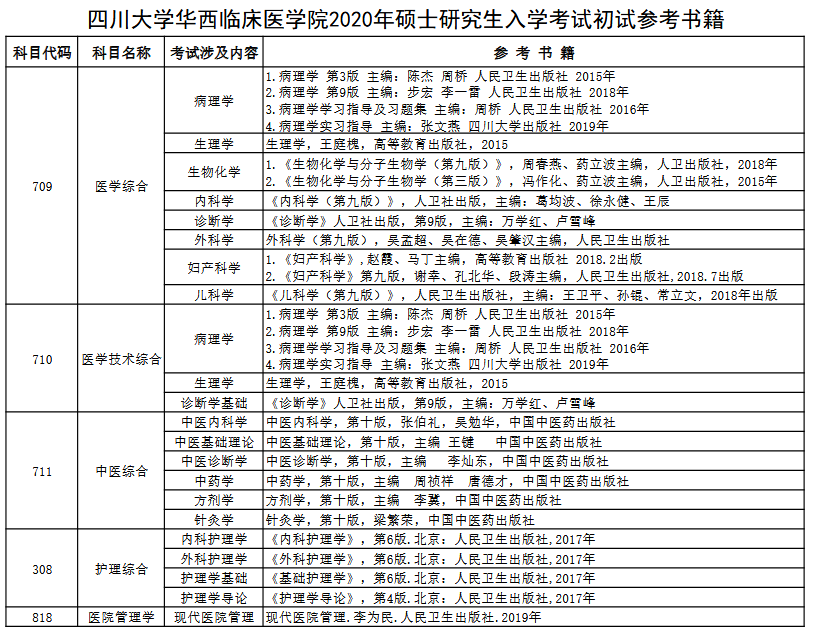 华西临床医学院2020硕士研究生入学考试初试参考书籍