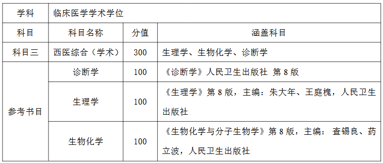 河北北方学院2020硕士研究生考试科目说明(西医)已发布,博傲教育为各位考生收集到以下信息,请相关考生注意。 一、2020年我校拟招收硕士研究生423人(不含退役大学生专项计划),其中全日制硕士研究生404人(基础医学22人、学术型临床医学50人、药学15人、作物学5人、农业硕士45人、临床医学硕士152人、中医硕士60人、教育硕士55人),非全日制硕士研究生19人。具体人数以教育部最终下达的计划为准。 二、考生报名条件参见河北北方学院2020年硕士研究生招生简章。 三、各专业招生计划,请考生详见《河北北方学院2020年硕士研究生拟招生计划》。 四、考试科目(一)学术学位 ...... 报考基础医学、临床医学学术型、药学,科目一为思想政治理论(101),科目二为英语一(201),科目三如下: 1.报考基础医学,科目三为基础医学综合(709),满分300分。科目三为学校自命题,包括生理学、生物化学、病理学各100分。 2.报考临床医学学术学位,科目三为西医综合(学术)(707),满分300分。科目三为学校自命题,包括生理学、生物化学、诊断学各100分(物理诊断50分,实验诊断50分)。 ...... (二)专业学位 1.报考临床医学专业学位,科目一为思想政治理论(101),科目二为英语一(201),科目三为国家统考(306)临床医学综合能力(西医),满分300分。 ...... 以上内容来自院校官网,希望能给各位考生带来帮助。 20年来,我们只做医考培训!医考热线电话:400-6286615 扫描立即做题 [海量练习][历年经典]等你练!