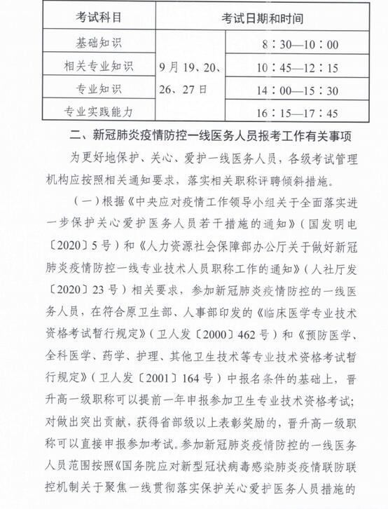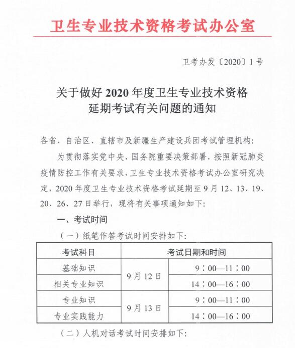卫生专业技术资格考试时间定于9月12、13、19、20、26、27日举行,具体考试安排如下: