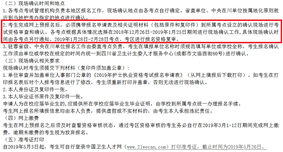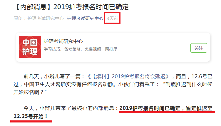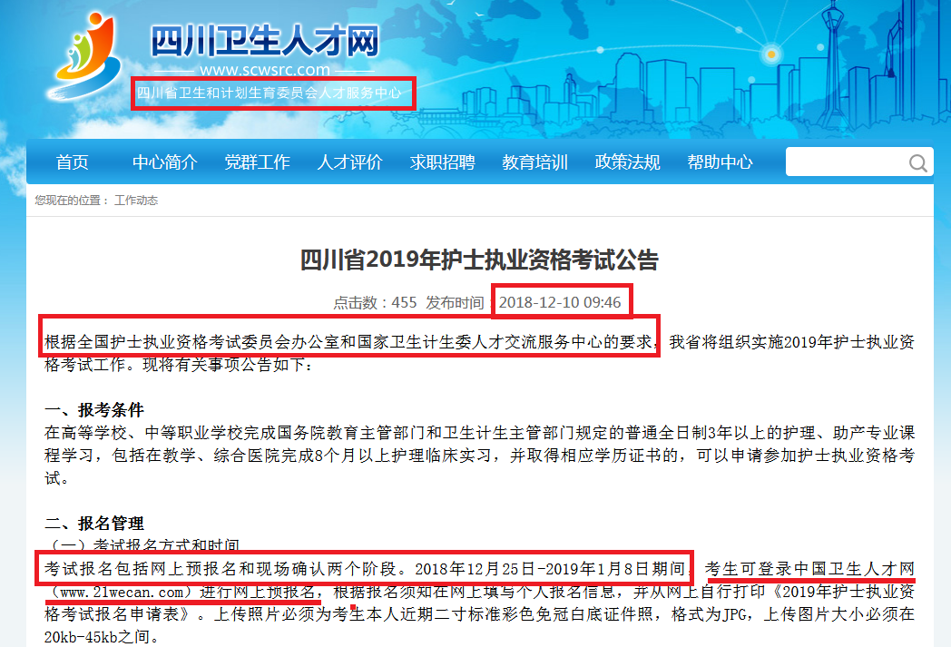 上周五,博傲教育网站小编刚得到消息写了一篇:《【内部消息】2019护考报名时间已确定》的文章,明确表示了博傲得到独家消息:2019护考报名将会在2018年12月25号开始! 周末刚过,就得到了官方网站实锤确定。四川卫生人才网,隶属于四川省卫生和计划生育委员会官方网站,于今早10点正式公布2019年护士考试报名和开考的具体时间。有人问了,“四川卫生人才网公布的可信吗,能代表全国的护考生吗?” 当然可信,大家别忘了。护士资格证考试是全国性的考试,全国统一报名、统一开考、统一阅卷、统一分数线的考试,所以,在某种程度上来说,四川卫生人才网有关2019护考报名和考试的消息是可以代表全国的考生。口说无凭,下面,博傲教育网站小编给你们展示一下卫生人才网的公告截图: 报名时间: 现场确认时间: 考试时间和安排: 博傲不仅知道什么时候考,还知道考什么。2019护考大纲正在独家发放,想收藏的小伙伴们赶紧扫描下方二维码,回复“护考大纲”就可以了。 我们能提前预知分数线,当然知道考什么!课程咨询热线:400-6286615 我们连续六年精准预测了护士考试分数线和考试大纲,扫描下面的“ChinaNERC”微信二维码或加QQ群号:656216869、780460254。即可提前获取各种最近护考信息: 扫一扫关注护理研究中心二维码