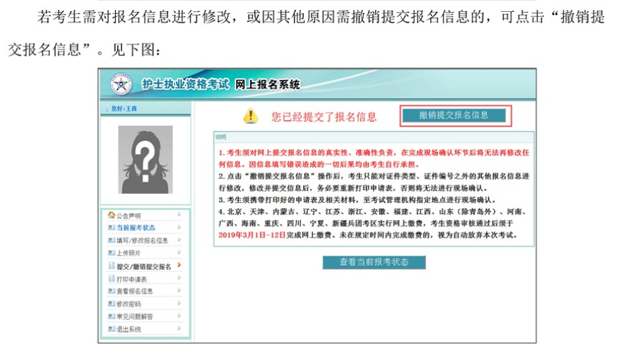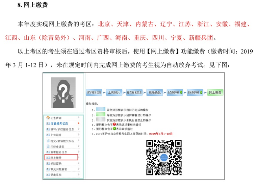 千呼万唤始出来,2019年的护士执业资格考试报名正式开始!大家从现在开始就可以陆续开始登录页面进行网上报名了。注意:本次报名分为网上报名和现场确认两个步骤,先在网上报名,再进行现场确认。 2019年全国各地的现场确认地点,缴费情况已出,截止节日,已有将近90个地区发布公告。详情点击查看《2019各考区考试公告、现场确认及缴费汇总》! 2019护考报名操作流程如下: 1、扫描下方中国卫生人才网的二维码进入网站 2、登录 3、查看当前报考状态 4、填写/修改报名信息 注意事项: 5、上传照片 6、提交/撤销提交信息 撤销已提交的信息步骤: 7、打印申请表 8、查看报名信息 9、网上缴费 10、修改密码 11、常见问题解答 12、退出系统 我们能提前预知分数线,当然知道考什么!课程咨询热线:400-6286615 我们连续六年精准预测了护士考试分数线和考试大纲,扫描下面的“ChinaNERC”微信二维码或加QQ群号:656216869、780460254。即可提前获取各种最近护考信息: 扫一扫关注护理研究中心二维码
