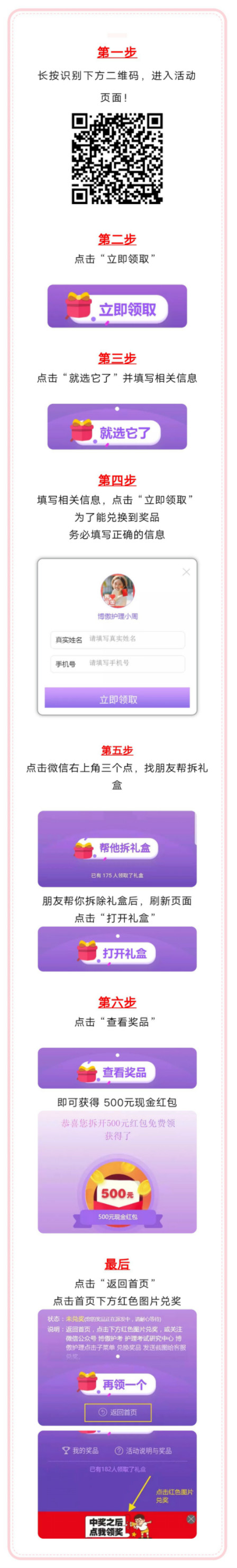 19护考硝烟未散,20护考迫在眉睫,正确的选择,可在不经意间帮你,渡过难关。网传20护考增加音频题!分数线若无变化,也固定在双三百,20年想要通过护考,难上加难! 为了更好的帮助护士考生顺利过关,金秋10月,博傲教育特免费发放护考课程优惠券,最高优惠额度500元! 优惠不是目的,只是为了你一考过关! 活动步骤 注意事项: 1.中奖后,返回活动首页,点击下方红色图片,或关注微信公众号博傲护考、护理考试研究中心、博傲护理,点击子菜单“兑换奖品”兑奖。 2.想要得到现金红包,必须邀请一人为自己拆礼盒。 3.每个小伙伴只可领取一次现金红包,领取红包后,请尽快联系老师兑换,否则会在一定时间后失效。 优惠券有效期:2019年10月11日至11月7日。 优惠券使用方法请长按下方二维码进行咨询: 我们能提前预知分数线,当然知道考什么!课程咨询热线:400-6286615 我们连续六年精准预测了护士考试分数线和考试大纲,扫描下面的“ChinaNERC”微信二维码或加QQ群号:656216869、780460254。即可提前获取各种最近护考信息: 扫一扫关注护理研究中心二维码 扫描下方金题二维码即可免费注册APP,海量模拟真题等你来!