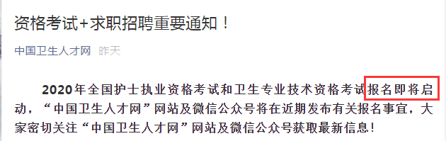 注意!中国卫生人才网刚刚通知:2020年护士资格考试报名即将启动!请各位2020年护士考生做好准备工作,密切关注博傲网校动态! 相信这对于各位护士考生来说是个重磅消息,根据历年护士考试报名时间规律来看,护士资格考试报名时间一般在12月中旬左右。这次2020年护士资格考试报名时间的提前可能跟2020年农历新年时间提前有关。总之,各位想要报考2020年护士资格考试的考生们,近期一定要多多关注网校动态,同时,提前准备好护士报名所需的材料。 护士资格考试报名所需材料: (一)护士执业资格考试报名申报表; (二)本人有效身份证明原件及复印件; (三)近6个月二寸免冠正面半身照片3张; (四)毕业证书或学位证书原件及复印件; (五)报考所需的其他材料。 申请人为在校应届毕业生的,应当持有所在学校出具的应届毕业生毕业证明,到学校所在地的考点报名。学校可以为本校应届毕业生办理集体报名手续。 申请人为非应届毕业生的,可以选择到人事档案所在地报名。 我们能提前预知分数线,当然知道考什么!课程咨询热线:400-6286615 我们连续六年精准预测了护士考试分数线和考试大纲,扫描下面的“ChinaNERC”微信二维码或加QQ群号:656216869、780460254。即可提前获取各种最近护考信息: 扫一扫关注护理研究中心二维码 扫描下方金题二维码即可免费注册APP,海量模拟真题等你来!