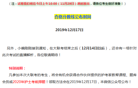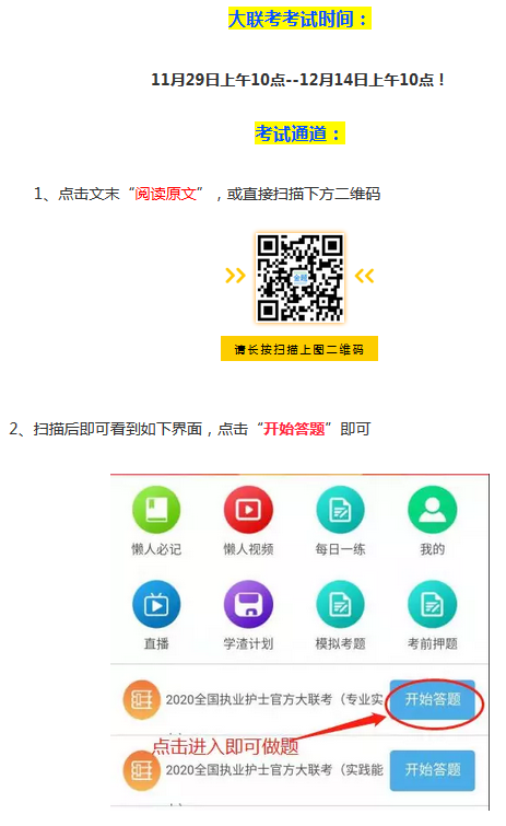 各位护士考生,20年护士官方大联考一级开始了,各位考生请速速就位,考试详情小编整理如下: 如果对本次大联考有疑问,请扫描下方二维码进群咨询: 我们能提前预知分数线,当然知道考什么!课程咨询热线:400-6286615 我们连续六年精准预测了护士考试分数线和考试大纲,扫描下面的“ChinaNERC”微信二维码或加QQ群号:656216869、780460254。即可提前获取各种最近护考信息: 扫一扫关注护理研究中心二维码 扫描下方金题二维码即可免费注册APP,海量模拟真题等你来!