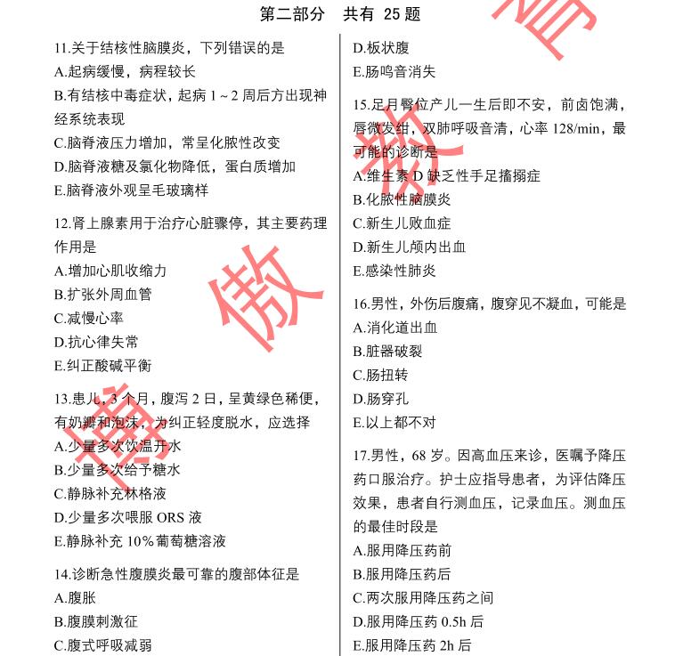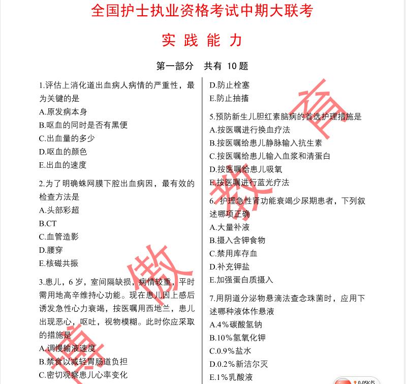 2020全国护士官方大联考(中期)已经圆满结束,参加此次考试的人数相当多,昨日,关老师针对(实践能力)测试部分作了在线解析! 部分考生受各种原因的影响,无法即时观看到关老师直播,对于试题正确答案不是很清楚,小编特整理(实践能力)正确答案如下图: 参加考试的小伙伴,可以根据此表,来判定自己错在哪里,有针对性进行分析,这样对日后的复习,还是相当有帮助的。 对于那些参加过(实践能力)的朋友,由于紧张,记不清楚原题的朋友,或是没有参加(实践能力)测试的朋友,小编特意整理电子版试卷,部分内容展示如下: 大联考(实践能力)第一部分测试 大联考(实践能力)第二部分测试 想获取完整版试卷的小伙伴,可以扫描以下二维码,加入20护士资格考试指导群,联系管理老师之后,便可获取完整版试卷! 在肺炎防疫的这个阶段,许多学员都呆在家中,无法返回学校。报名参加护考的朋友,利用此阶段好好学习。面授课程无法进行,选择博傲网课成为优先之选。 我们能提前预知分数线,当然知道考什么!课程咨询热线:400-6286615 我们连续六年精准预测了护士考试分数线和考试大纲,扫描下面的“ChinaNERC”微信二维码或加QQ群号:457734051(护士)、471131230(护师)。即可提前获取各种最近护考信息: 扫一扫关注护理研究中心二维码 扫描下方金题二维码即可免费注册APP,海量模拟真题等你来!