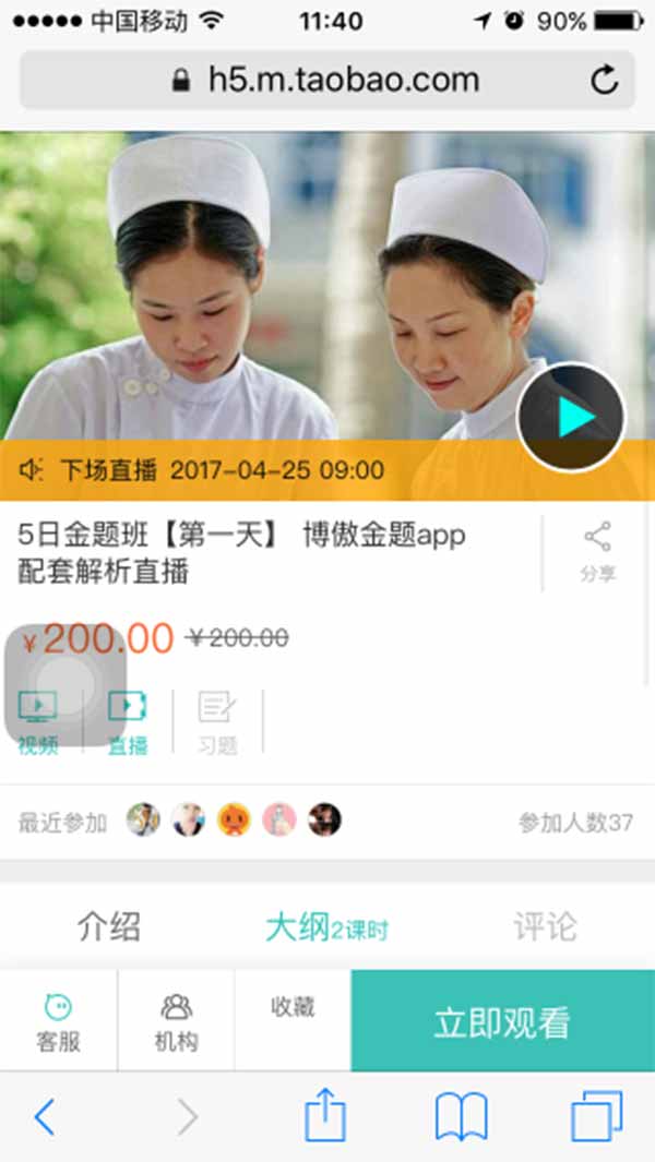 执业护士五日金题班手机端上课流程(手机验证码登陆情况)。 第一步: 用手机微信扫描二维码: 第二步:进入如下页面: 第三步:点击“提示”右边的三个点,弹出页面: 第四:点击“在Safari中打开”,跳转到此页面: 第五步:点击“参加课程”后,跳到如下页面: 第六步:输入自己的淘宝账号及密码进行登录,或用手机号和短信验证码登录: 第七步:输入手机收到的验证码: 第八步:登录成功后,自动跳到此页面,点击:立即观看 第九步:点击大纲,显示该公开课具体播放时间: 五日金题班上课时间表: 4月25日:第一天课程 4月26日:第二天课程 4月27日:第三天课程 4月28日:第四天课程 4月29日:第五天课程 备注:每天的课程上课时间为:上午9点到12点和下午14点到17点才会正式开播,错过这两个时段将无法观看! 我们能提前预知分数线,当然知道考什么!课程咨询热线:400-168-0561 我们连续五年精准预测了护士考试分数线和考试大纲,扫描下面的“boaohuli”微信二维码或加QQ群号:516874108、316414596。即可提前获取各种最近护考信息: 扫一扫关注博傲护理二维码 首款完全按照“人机对话”开发的免费软件,历年真题一网打尽!