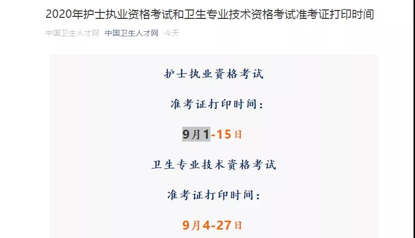 无论报名参加护士资格考试,还是初级、主管护师考试,准考证都是进入考场的关键,考生对于准考证打印时间都十分在意。 中国卫生人才网重磅通知:2020年护士执业资格考试,准考证打印时间9月1-15日,卫生资格考试准考证打印时间:9月4日-27日。 有了准考证打印的确切消息,考生就应当静下心来复习,若此时还处于迷糊状态,那考试的结果可想而知! 考生想在考试中胜出,就必须付出极大的努力,把知识点理解并吃透,方能灵活应对考题变化,提升答题正确率,通过考试机率才会更高。 我们能提前预知分数线,当然知道考什么!课程咨询热线:400-6286615 我们连续六年精准预测了护士考试分数线和考试大纲,扫描下面的“ChinaNERC”微信二维码或加QQ群号:457734051(护士)、471131230(护师)。即可提前获取各种最近护考信息: 扫一扫关注护理研究中心二维码 扫描下方金题二维码免费注册APP,海量模拟真题等你来!